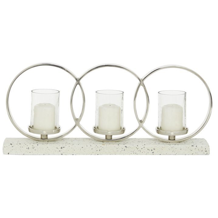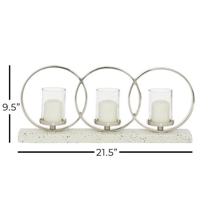 DecMode 3 Holder White Aluminum Pillar Candelabra with Aluminum Accents is a unique addition to your stylish home. Delight your guests and make any occasion extra special by adding a lighted or flameless candle to this lantern. Made with a sturdy base, it is perfect for creating an elegant atmosphere at your table top or mantel. Use this candle holder centerpiece to add beauty and light your mantel or coffee table. Designed with felt or rubber stoppers at the base that prevent scratching furniture and table tops, as well as sliding around. Can hold 3 votive candles, not included. This item ships in 1 carton. Suitable for indoor use only. This item ships fully assembled in one piece. Made in India. This is a single white colored candlestick holder. Contemporary style.